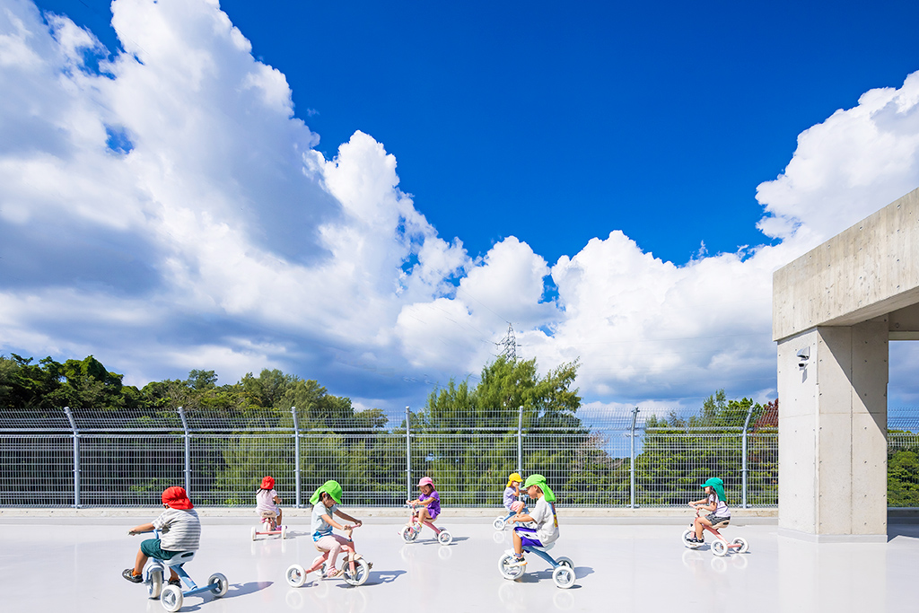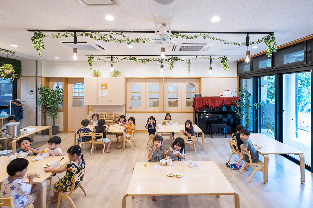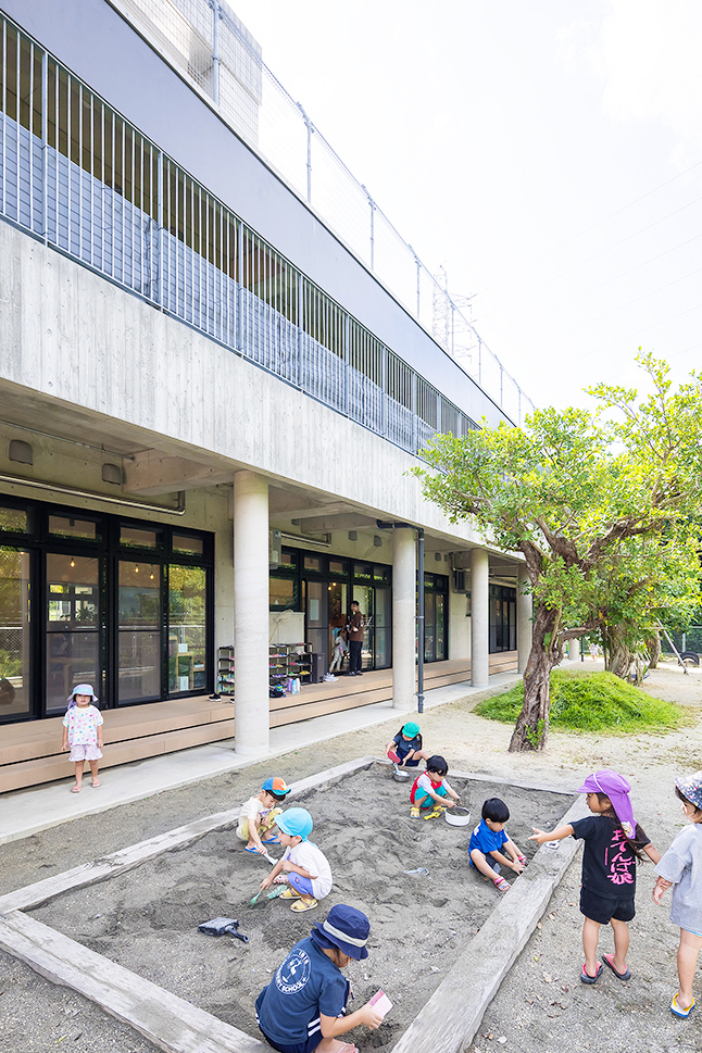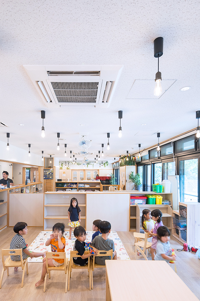 地域の特性として防音サッシを閉め切って保育をして安心できる環境を守りながら、遊び心や子どもの主体性を大切にする園舎です。