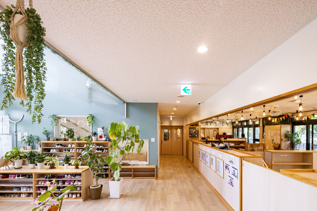 カフェのように保護者やスタッフが集える場所づくりをするため、素材を生かした落ち着いた色合いとすることや沖縄らしい南国の雰囲気があるヤシやゴムの木を植栽しています。かわいいで飾らずに子どもたちも大人の感性のなかで成長していくことを目指しています。