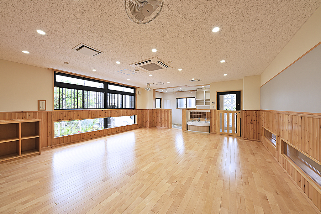 建物内部は玄関正面に厨房を配置。窓を多く設置する事で園児が調理の様子を見える様にし、食育を学べる設計プランとしました。