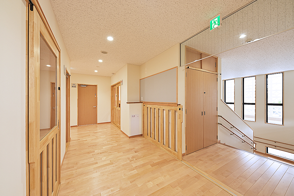 「保育室内をどこからでも見えるようにしたい。」との要望があり、廊下側、調乳室側、内部階段等、どこからでも保育室内を見えるように窓を多く配置し、子供たちの様子を伺いやすい様にしました。